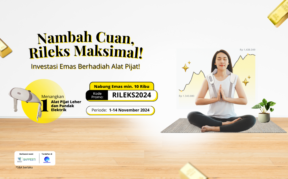 Sobat hanya perlu nabung emas minimal Rp 10.000 di aplikasi Treasury. Jangan lupa gunakan kode promo RILEKS2024 saat membeli emas selama periode 1 November – 14 November 2024. Gampang kan? Nah, jika Sobat ingin ikutan promonya, simak syarat dan ketentuannya di bawah ini.