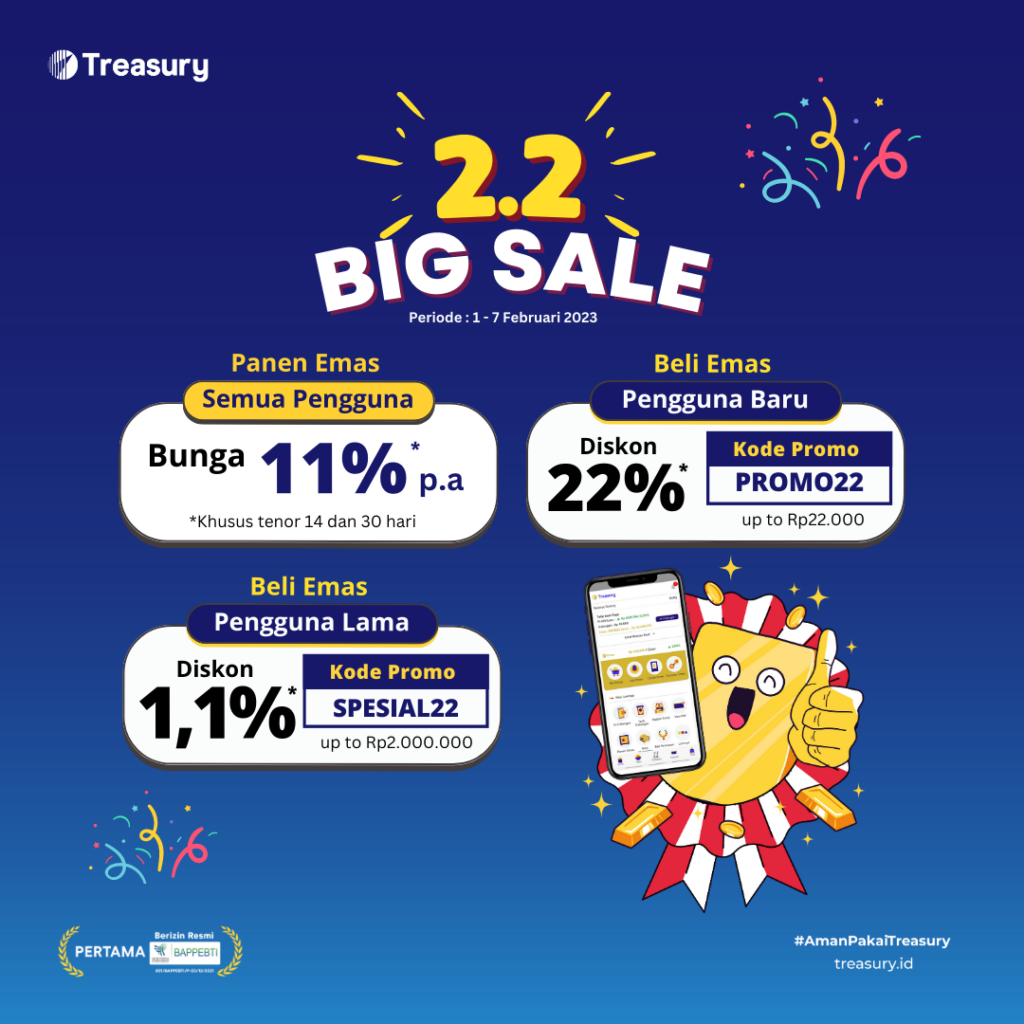 - “Promo 2.2” adalah promo diskon pembelian Emas melalui menu Beli Emas pada Apps Treasury;