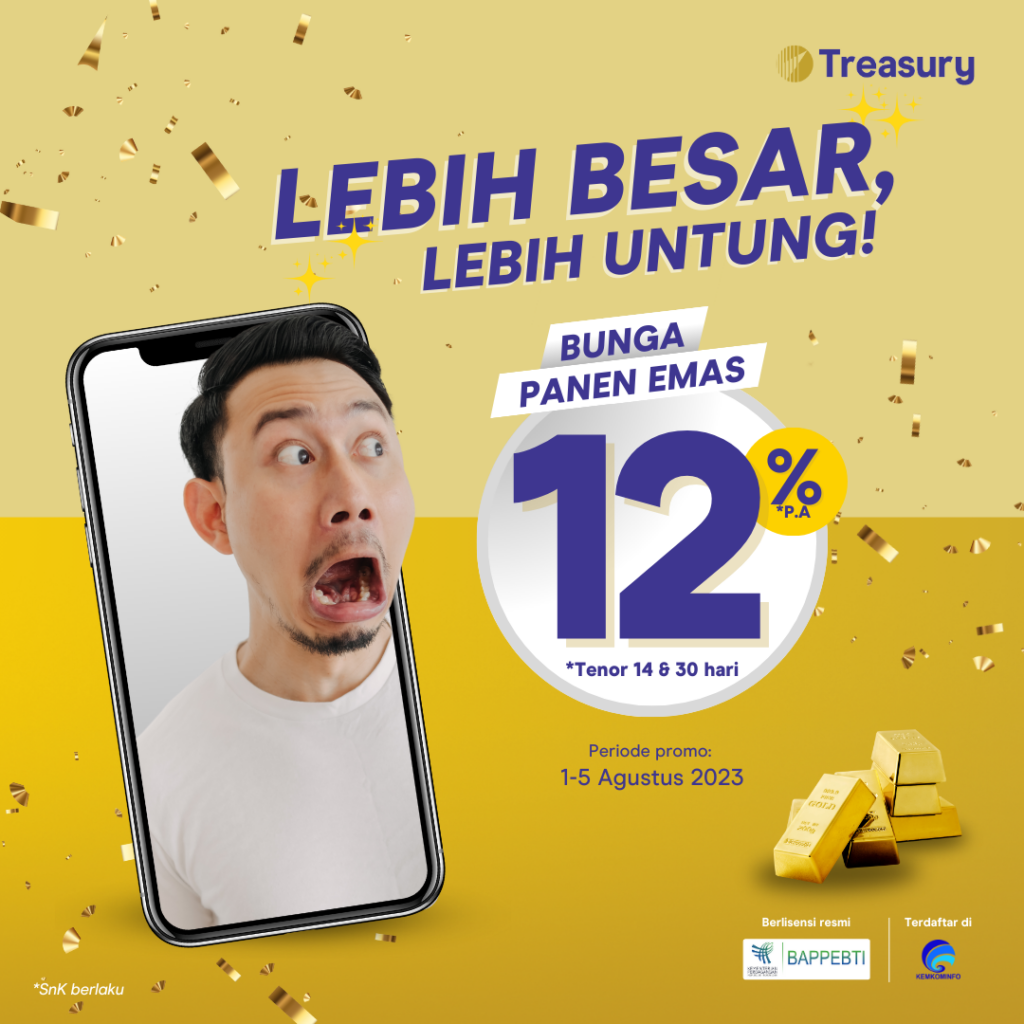 - Saldo Emas yang disimpan selama Durasi Panen Emas yang dipilih oleh Pengguna Treasury akan dikirimkan ke saldo Emas Pengguna Treasury saat Durasi Panen Emas berakhir beserta dengan Bonus Emas yang didapatkan pada saat berlangsungnya Periode Promo;