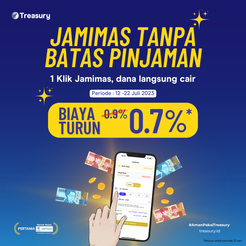 Tanggal tua tapi kebutuhan masih banyak, mau jual emas tapi sayang. Tenang! Jamimas, solusinya! Nikmati biaya Jamimas turun dari 0.9% menjadi 0.7% hanya selama 12 – 22 Juli 2023 untuk tenor 15 hari.