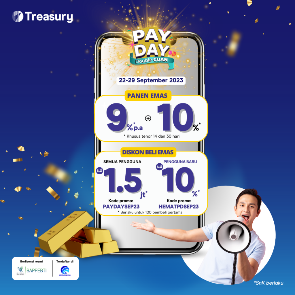 - “Promo Payday” adalah promo diskon pembelian Emas melalui menu Beli Emas pada Apps Treasury;