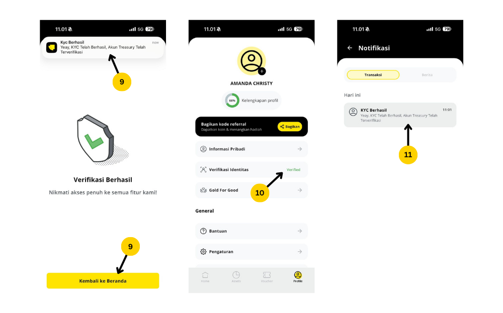 - Pada menu Notifikasi, User bisa melihat notifikasi KYC Berhasil